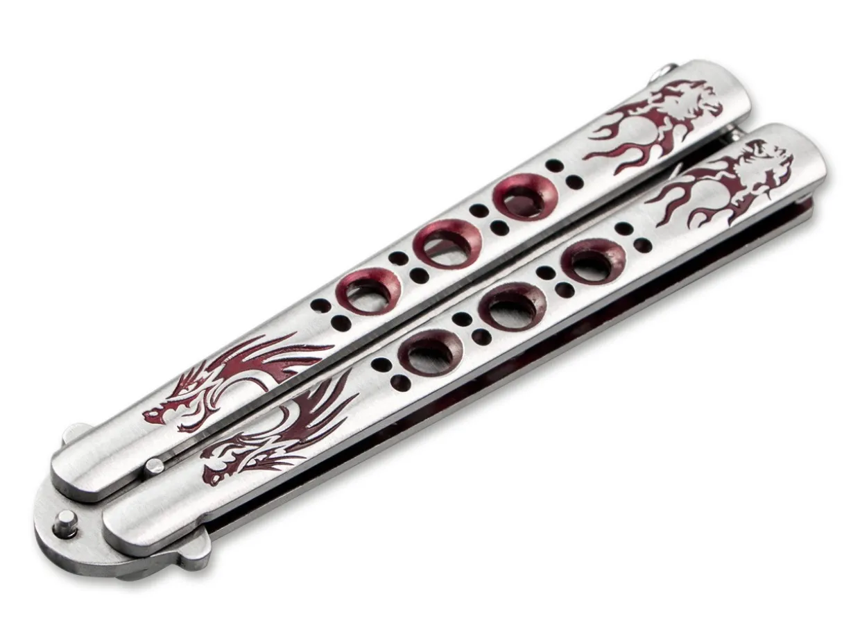 Balisong-Knife With Milled Dragon Pattern On The Stainless Steel Handle. The Modified Tanto Blade Is Made Out Of 440A.
