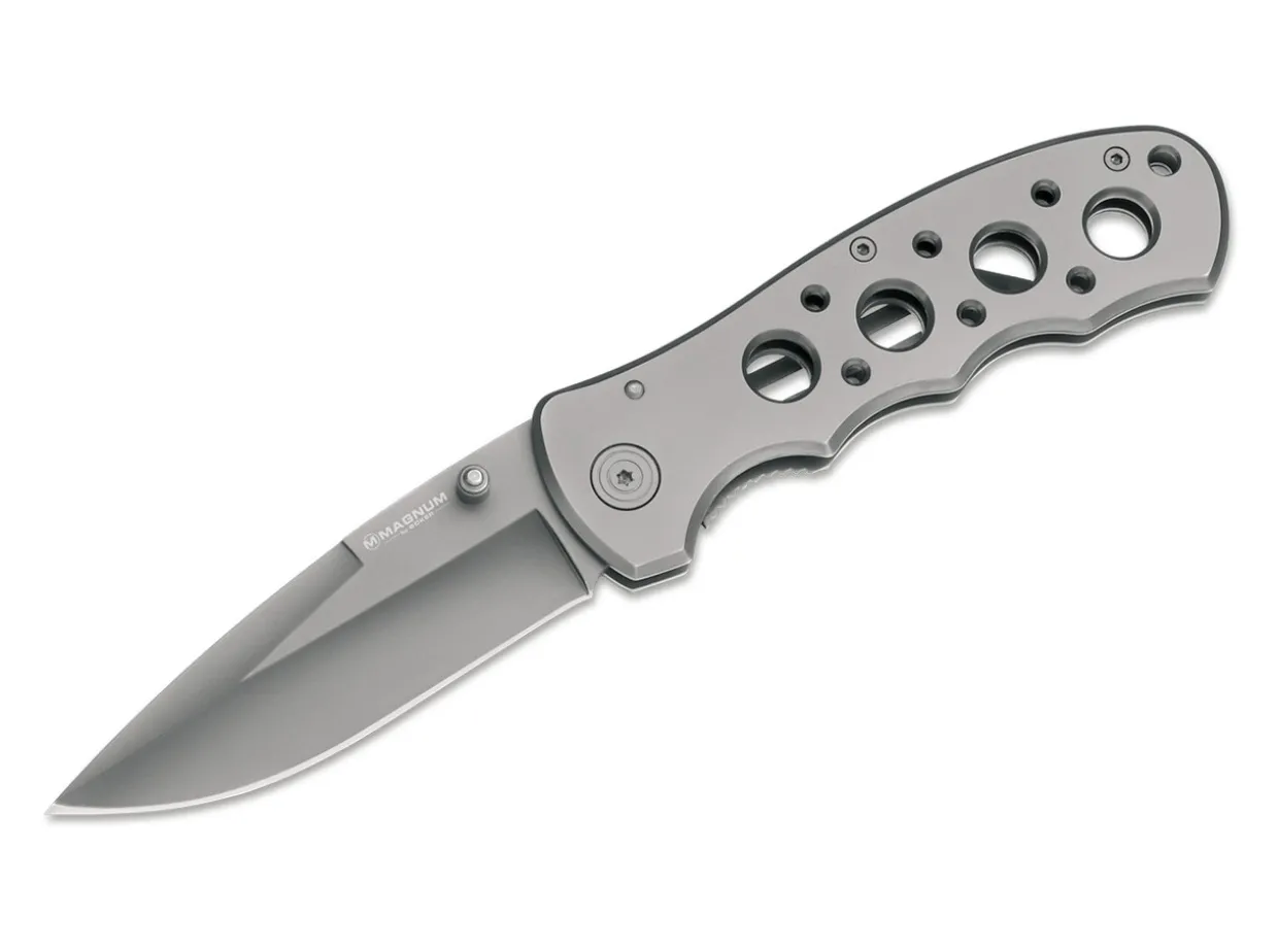 The Magnum Dark Force Has A 440A Blade That Is Titanium Coated Just Like The Handle. That Adds An Elegant Touch To The Pocketknife And Protects It From Corrosion. The Linerlock Prevents Accidental Closing Of The Super Sharp Blade. The Aluminum Handle Features Decorative Holes To Reduce Weight, Includes A Lanyard Hole For Convenience And A Clip.