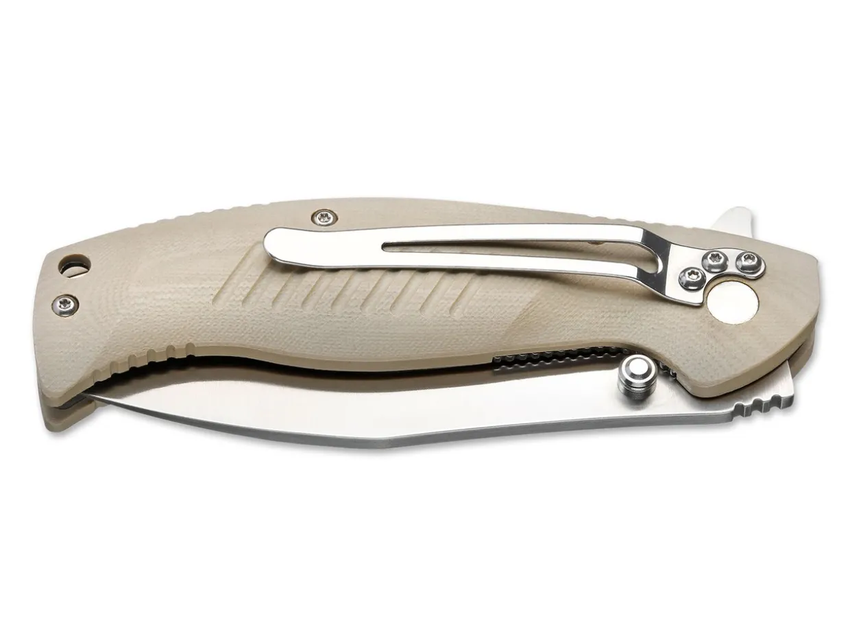 Suitable For Fine, Precise Work As Well As Tough Jobs.The Modified Wharncliffe Blade Has A Well Defined Tip For Fine Work, And The Tough 440B Steel Ensures Superior Edge Retention.The Sand Colored G10 Scales Are Reinforced With Stainless Steel Plates.With Pocket Clip And Lanyard Hole.