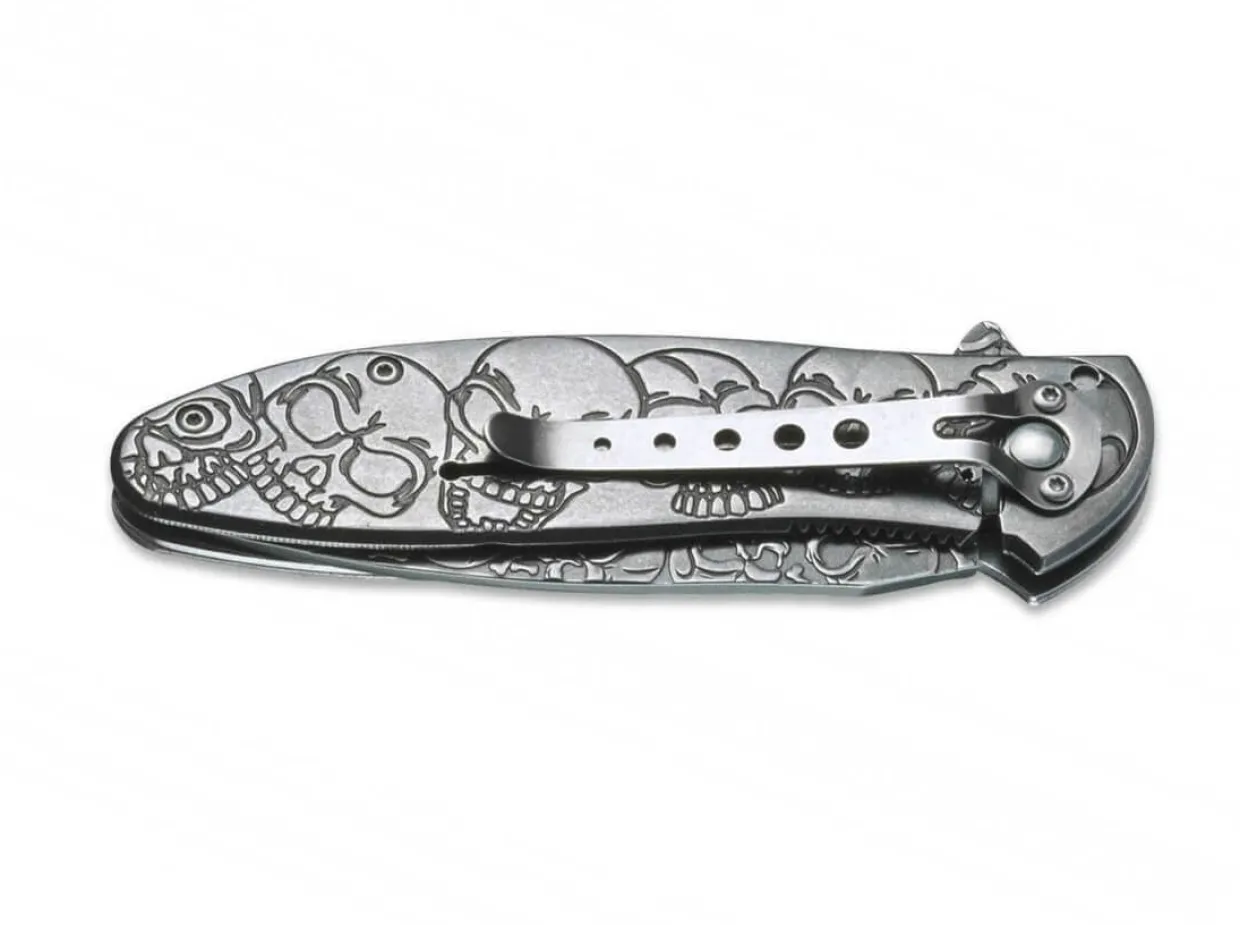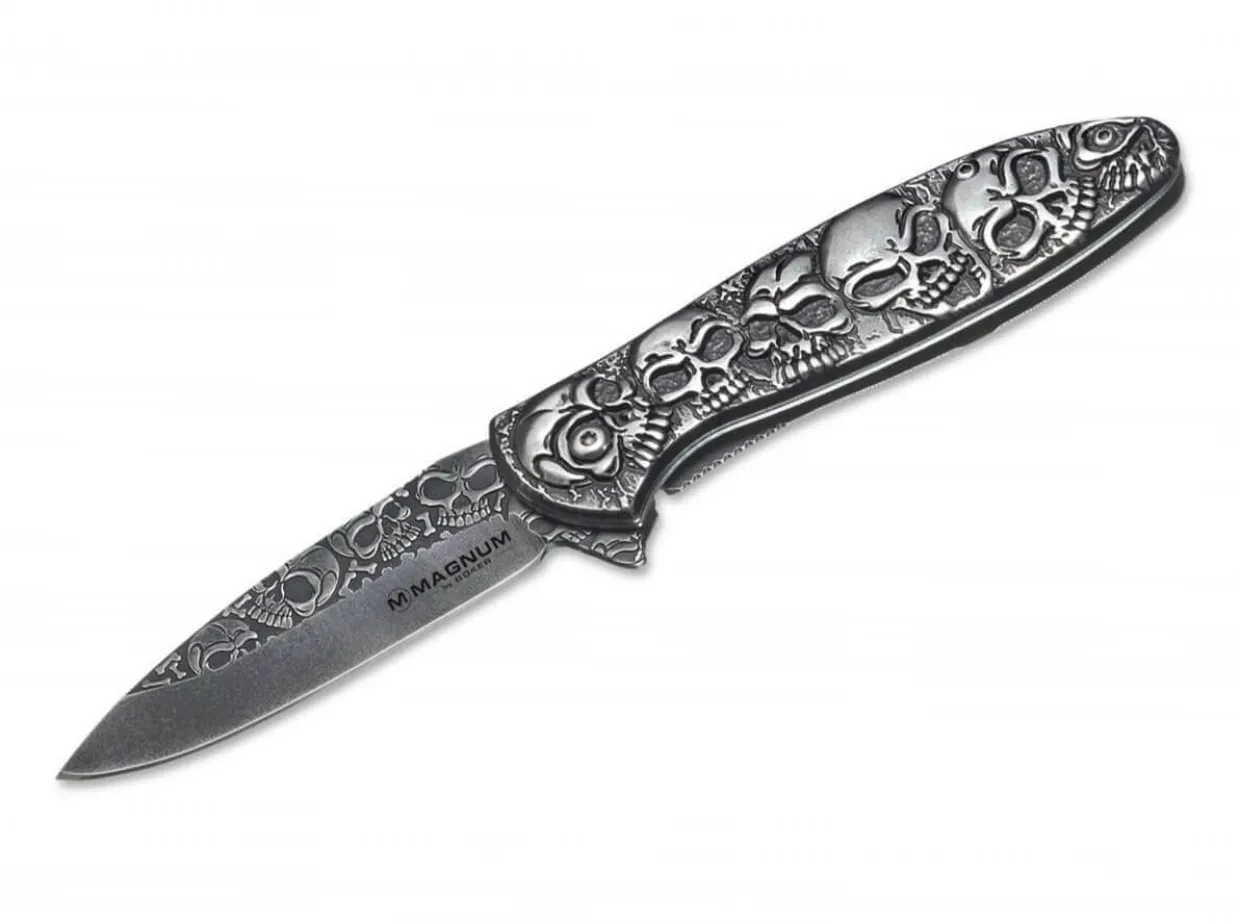The Magnum Dia De Los Muertos Is A Original Pocketknife With A Large Number Of Skulls. It Has Its Name From The Day Of The Dead, One Of The Most Important Mexican Holidays. It Focuses On Gatherings Of Family And Friends To Pray For And Remember Friends And Family Members Who Have Died. The Molded Grip Gives The Skulls An Incredibly Textured Appearance. The 440A Blade Is Also Embellished With A Large Number Of Skulls And Bones, And Is Easily Opened With The Spring-Assisted Flipper. Includes Linerlock And Clip.