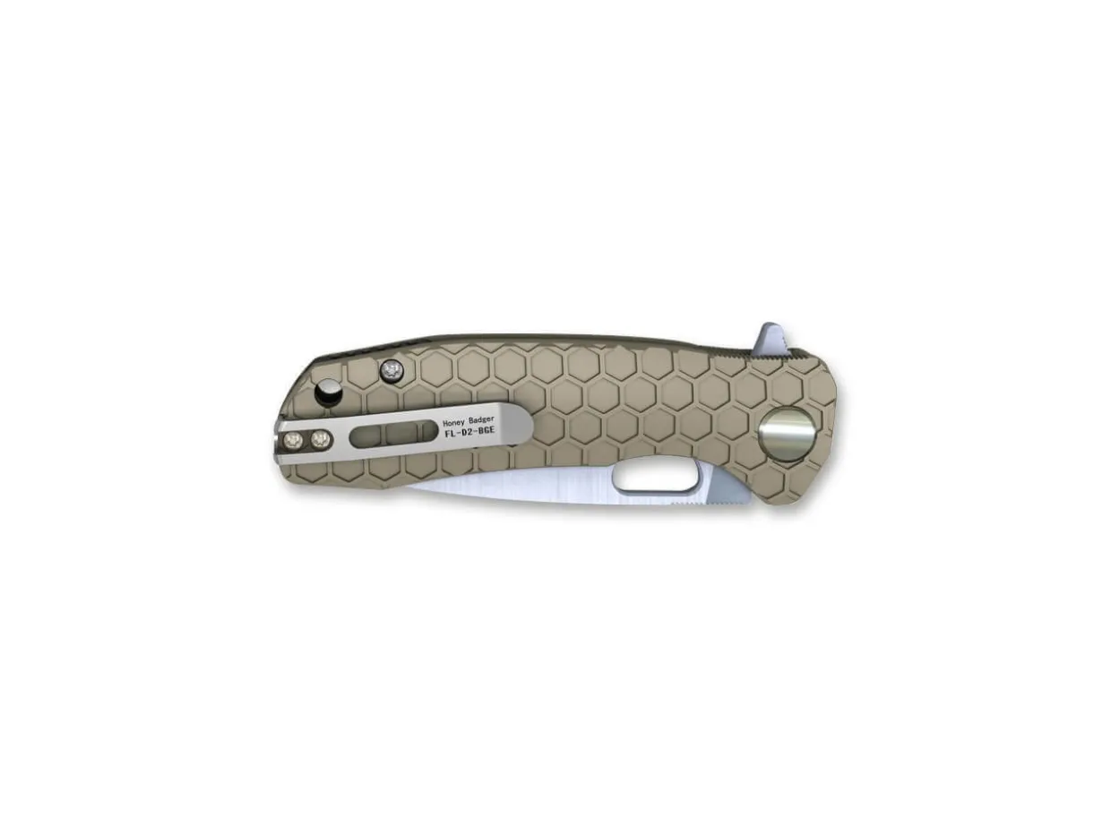 Der Honey Badger Flipper Large Uberzeugt Insbesondere Mit Seiner Widerstandsfahigen Konstruktion. Die Droppoint-Klinge Aus Schnitthaltigem D2 Ist Uberaus Robust Und Leicht Zu Scharfen. Der Dicke Schaft Und Das Breite Profil Mit Vollem Flachschliff Sorgen Fur Stabilitat Und Einfaches Schneiden. Das Hochwertige Kugellager Ermoglicht Das Reibungslose Offnen Und Schliesen Der Satinierten Klinge, Die Per Flipper Oder Daumenoffnung Geoffnet Werden Kann. Das Honigwaben-Muster Der Texturierten, Hellbraunen Griffschalen Aus Frn Sorgt Fur Eine Sichere Handlage. Mit Burgunderrotem Spacer, Fangriemenose Und Umsetzbarem Deep-Carry-Clip (Tip-Up/L-R).