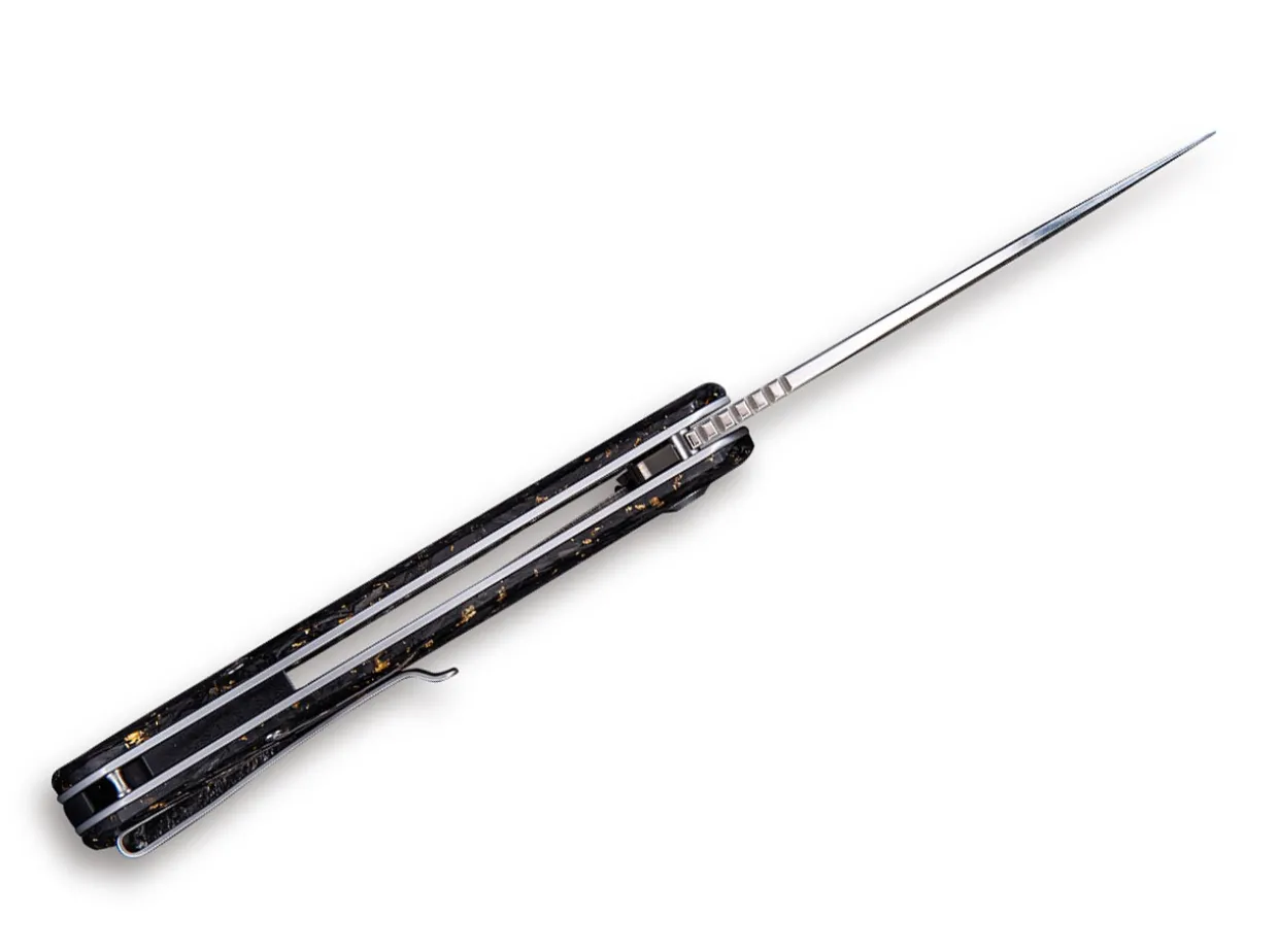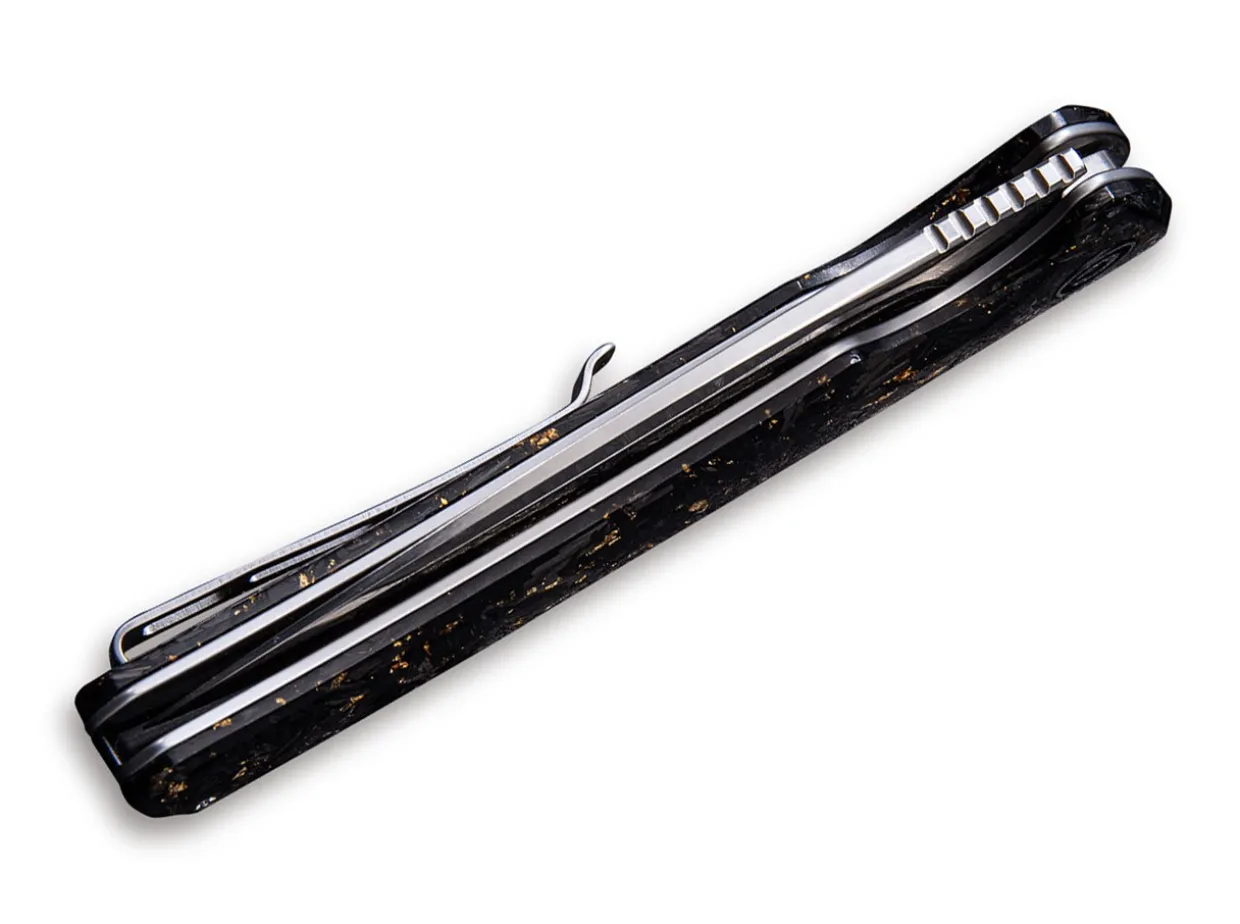 Available In Different Color Variations, This Version Of The Civivi Incite C908Ds-1 Sports A Striking Shredded Carbon Fiber Handle With Gold Accents. This Unusual Handle Is Paired With A Damascus Steel Blade, Which Skillfully Completes The Look. As Well As Being A Beauty To Look At, The Incite Also Has Technical Finesse. The Ball Bearing Mounted Blade Can Be Opened Quickly With The Flipper And Is Secured With A Linerlock. With Clip (Tip-Up).