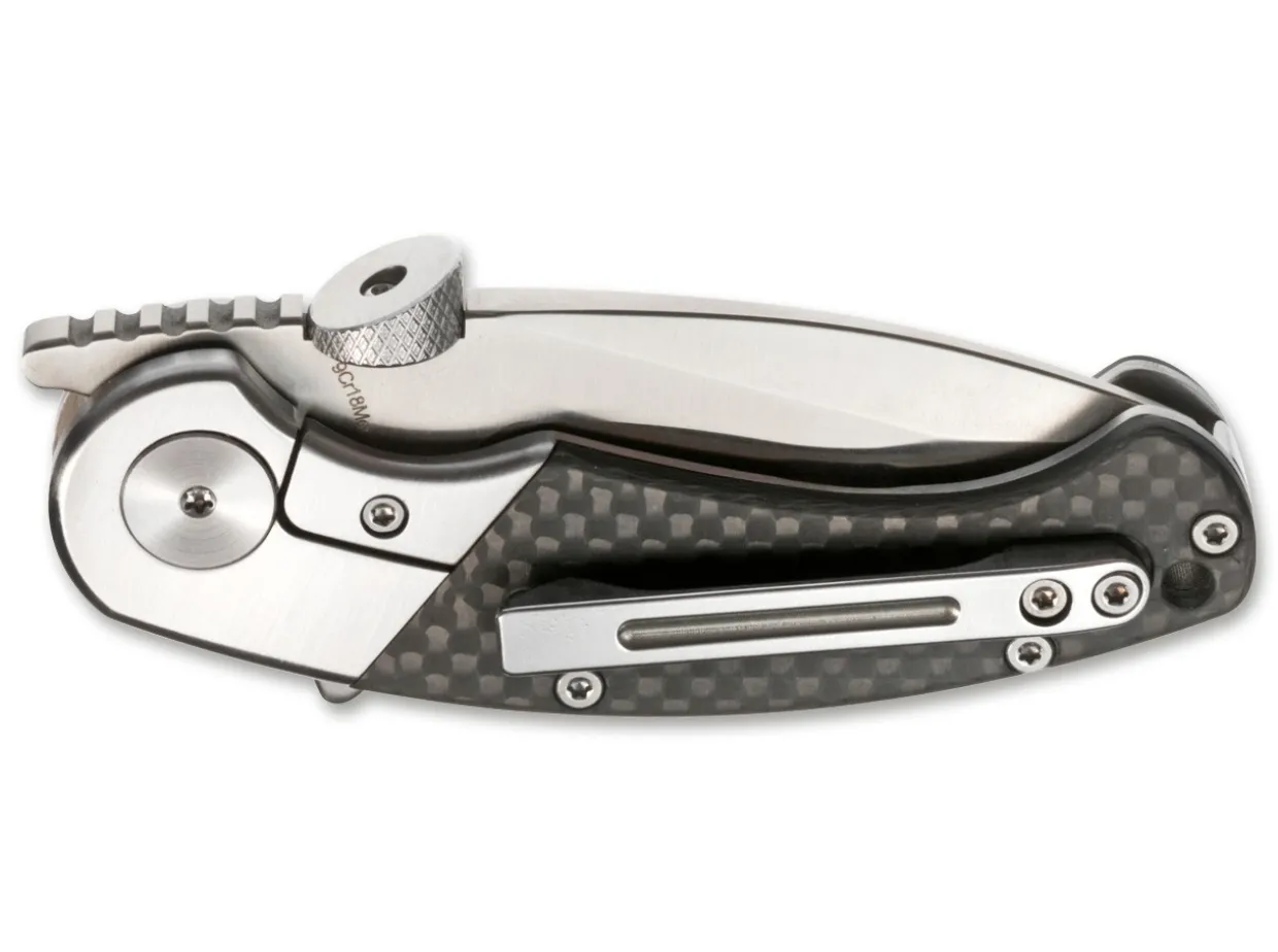 The Slightly Angled Blade Of The Very Compact Iota In Combination With The Curved Stainless Steel Handle And The Recurve Grind Of The Blade Ensure Maximum Effectiveness When Slicing. The Prominent Guard Ensures Maximum Safety. Handle Scales Made From Light-Weight Carbon Fiber. The Blade Moves On Ceramic Bearings And Opens Per Thumb Wedge (Which Also Acts As Opening Hook At The Pocket Fringe) And Per Front Or Standard Flipper. With Bolster Lock, A Variant Of The Frame Lock. Reversible Clip (Tip-Up / L-R).