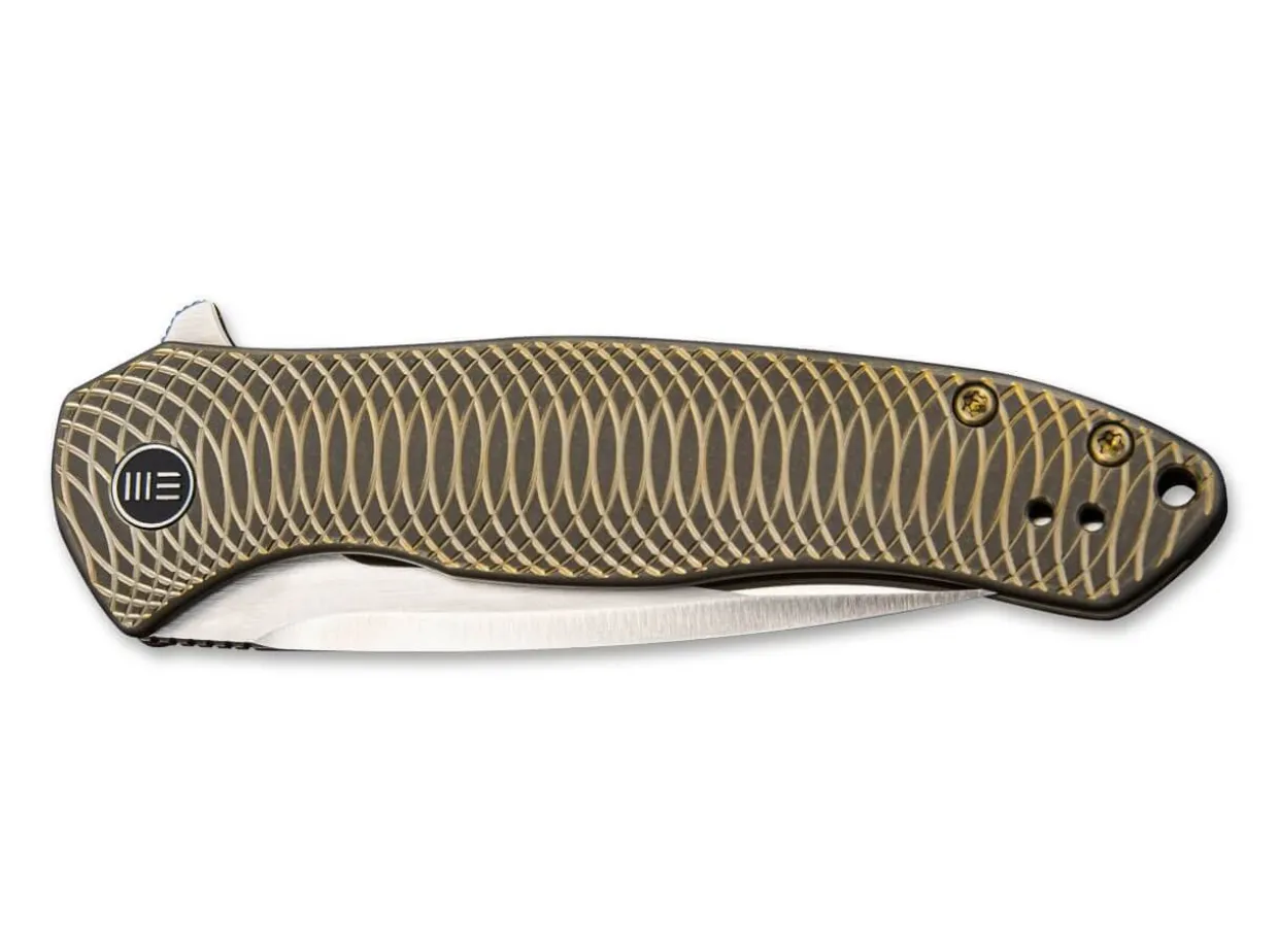 Das Wee Knife Kitefin Ist Ein Mittelgroses, Universell Einsetzbares Edc Messer Mit Einer Breiten Droppoint-Klinge Aus S35Vn, Die Eine Groszugige Fingermulde Fur Detailschnitte Beherbergt. Der Flipper Sorgt Fur Sanftes Offnen Der Kugelgelagerten Klinge Und Dient Zugleich Als Fingerschutz. Ein Solides Framelock Halt Die Klinge Fest In Ihrer Position Und Ermoglicht Somit Sicheres Arbeiten. Die Kitefin Messerserie Ist In Unterschiedlichen Grifffarben Und –Stilen Erhaltlich. Diese Version Ist Mit Formschonen Bronzefarbenen Griffschalen Aus Titan Mit Aufwendig Eingravierten Goldverzierungen Ausgestattet. Mit Fangriemenose Und Umsetzbarem Deep-Carry-Clip (Tip-Up).