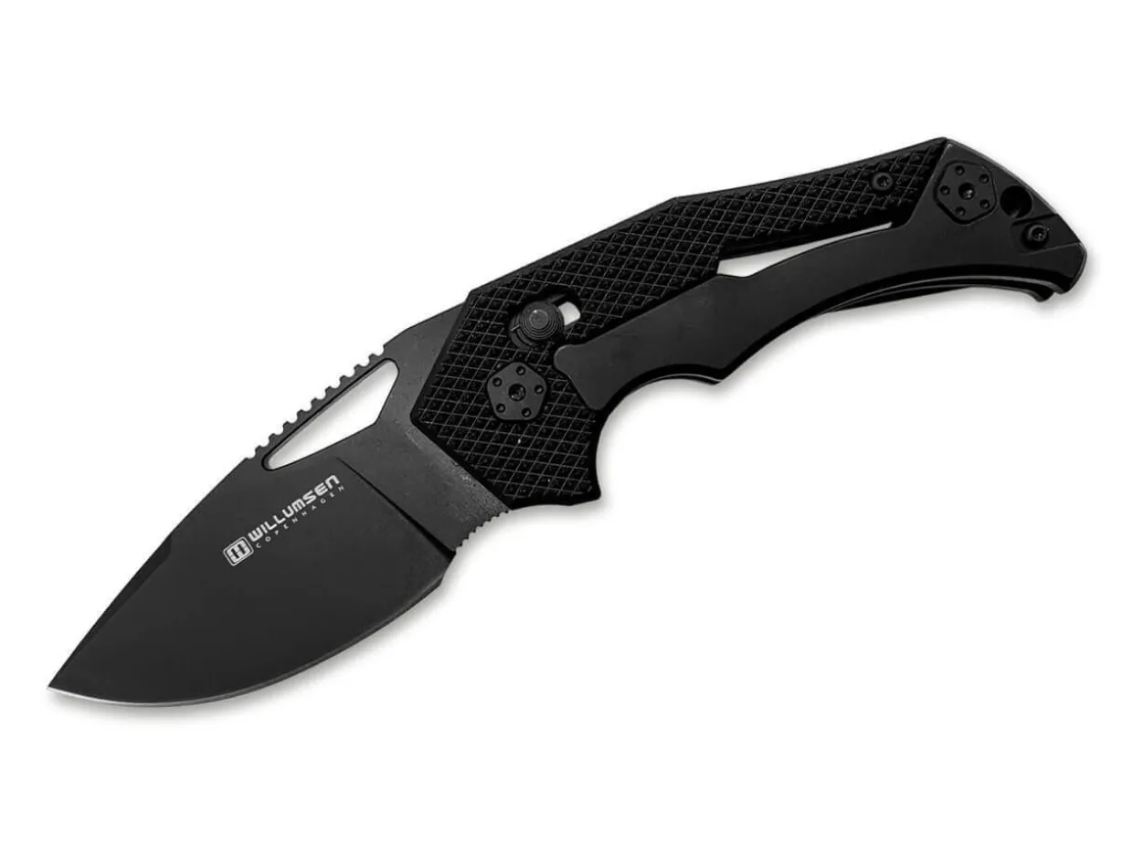 The Compact Willumsen Red E Midnight Is A Problem Solver For Everyday Cutting Tasks. Its Black D2 Blade Opens With A Thumb Hole And Locks With The Clever Axis Lock. The Non-Slip Handle Is Made Of A Material Mix Of G10 And Stainless Steel. With A Lanyard Hole And A Clip (Tip-Up / R).