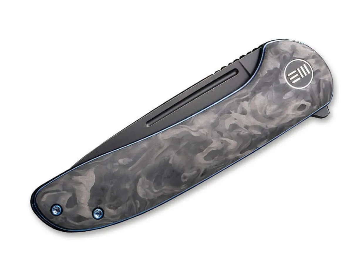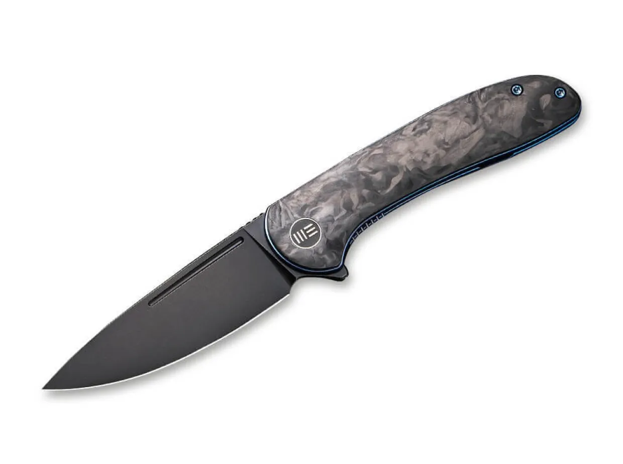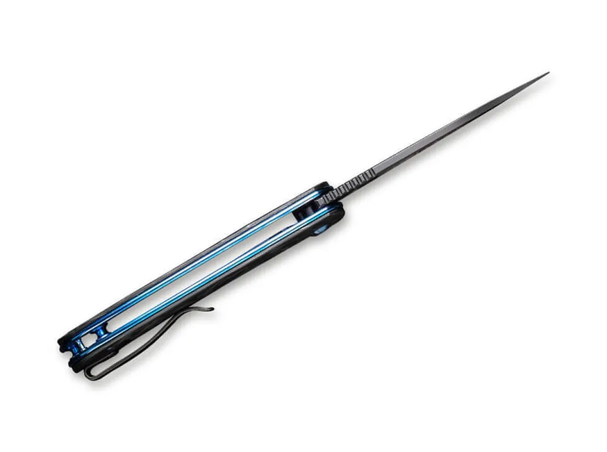 The We Knife Saakshi Is One Of The Elegant Edc Knives And Convinces With Its Black Blade Made Of Powder Metallurgical Cpm-20Cv And An Ergonomic Handle Made Of Carbon Fiber. Flipper And Linerlock Promise An Uncomplicated And Safe Work With The Knife For Everyday Cutting Tasks. With The Blue Anodized Bolts And Liners, The Saakshi Sets Colorful Accents. With Clip (Tip-Up/R) And Matching Case.