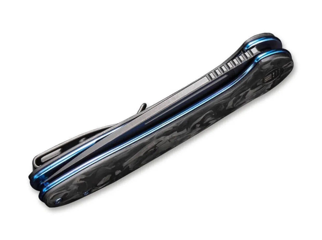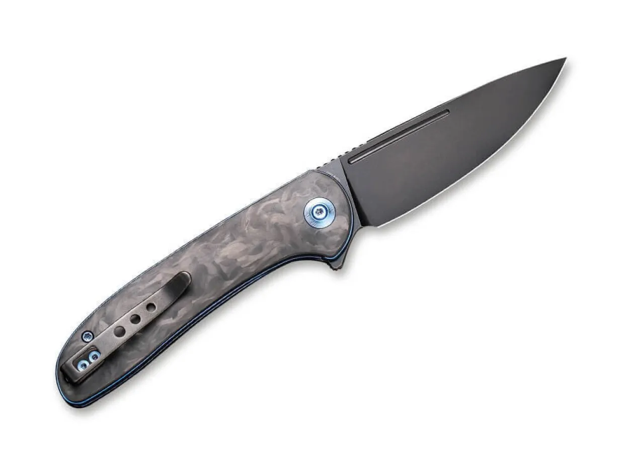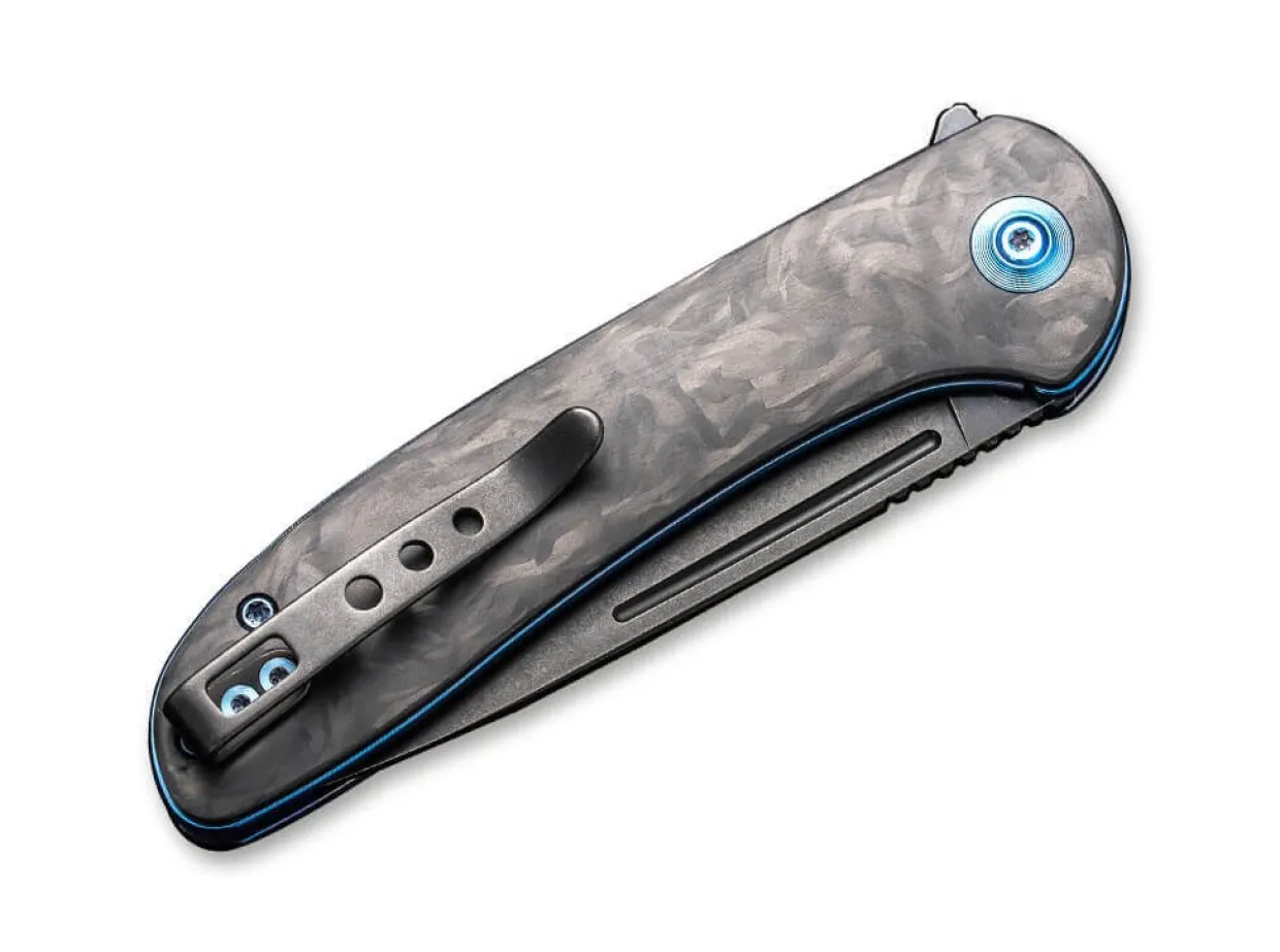 The We Knife Saakshi Is One Of The Elegant Edc Knives And Convinces With Its Black Blade Made Of Powder Metallurgical Cpm-20Cv And An Ergonomic Handle Made Of Carbon Fiber. Flipper And Linerlock Promise An Uncomplicated And Safe Work With The Knife For Everyday Cutting Tasks. With The Blue Anodized Bolts And Liners, The Saakshi Sets Colorful Accents. With Clip (Tip-Up/R) And Matching Case.