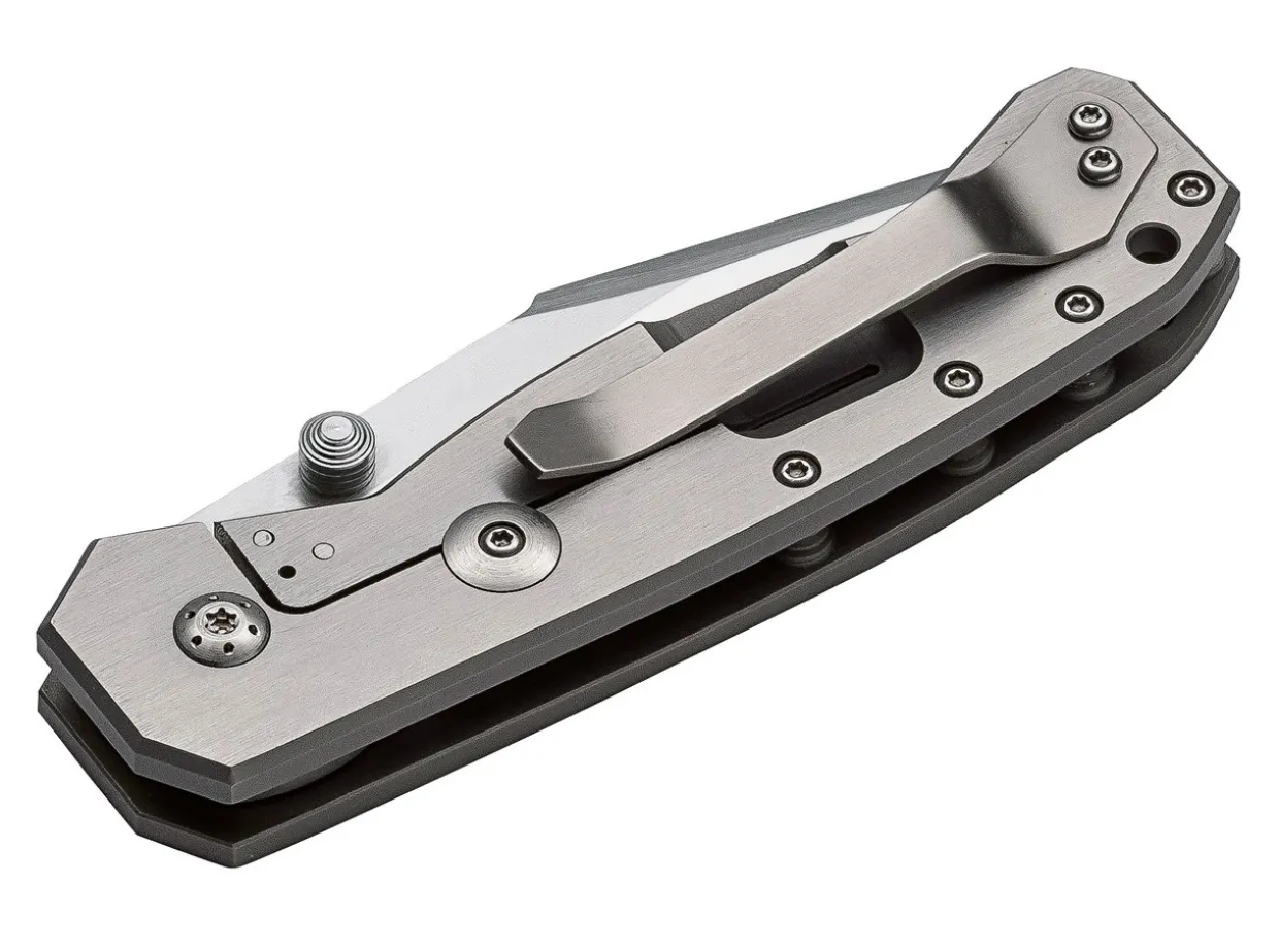 The New Generation Of The Scoundrel By Steve Kelly From Montana Not Only Comes With A Satined Blade, But Also With A Handle With A Very Exclusive Two-Tone Finish In Which Matt And Satined Surfaces Combine To Create An Extraordinary Overall Impression. The Massive Titanium Handle Locks The Vg-10 Blade With A Frame Lock And A Lock Bar Stabilizer Keeps The Lock From Overextending. A Tough Knife With Elegant Appearance. With Clip (Tip-Up).