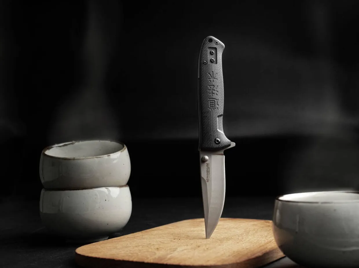 The Magnum Small But Serious Is Compact, Yet Reliable, Effective And Samurai Serious. The Backpoint Blade Of Stainless Steel 440A With Ricasso Is Rather Light And Can Be Opened With Spring Support At An Impressive Speed. The Blade Is Secured With A Reliable Linerlock. A Thumbstud And Flipper Help With Opening The Blade. The Black G10 Handle Scales Sport A Milled Pattern Of Japanese Letters To Ensure A Secure Grip. The Tip-Up Clip Can Be Repositioned For Right– And Left-Handed Users.