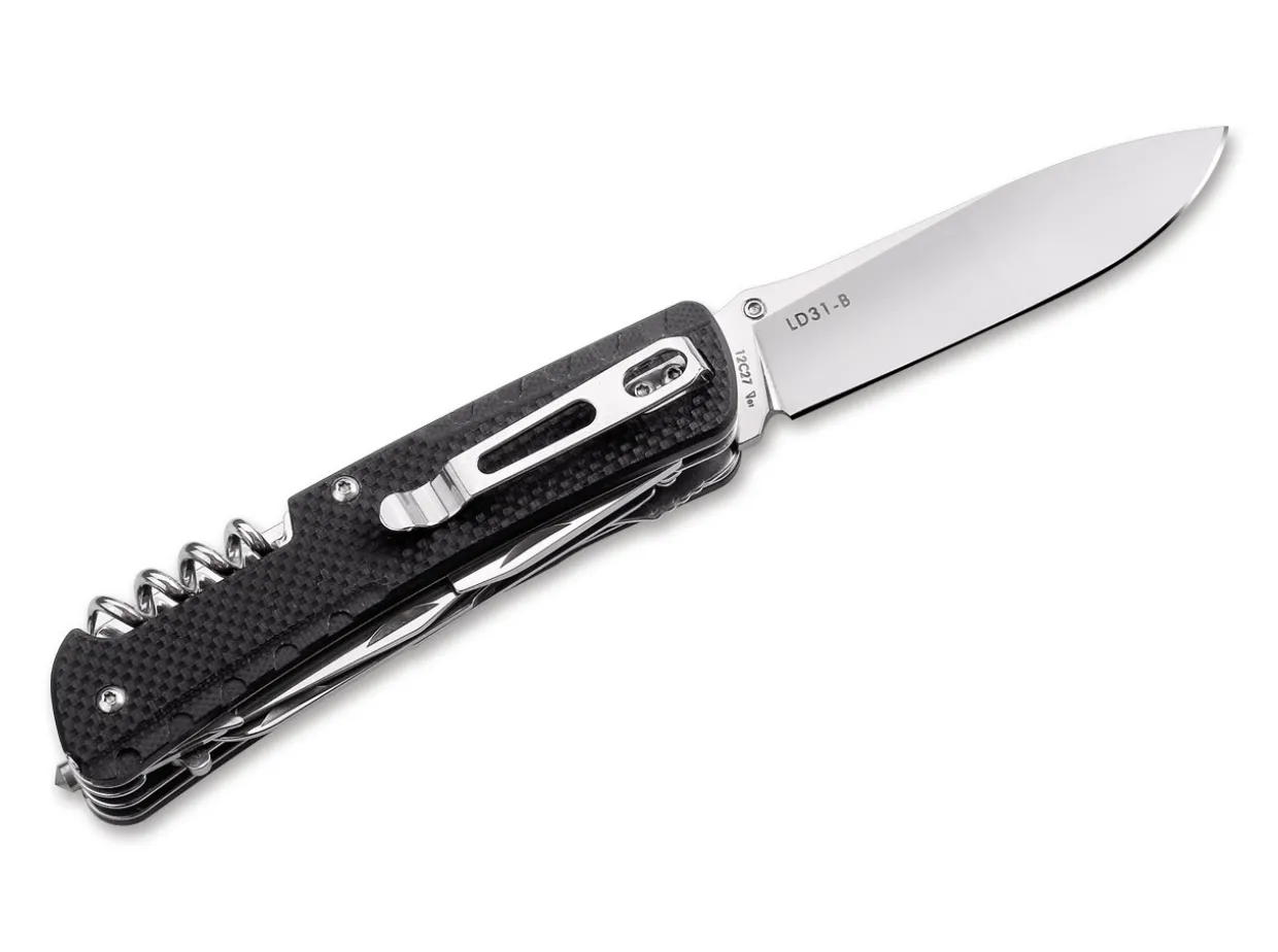 The Ld31 Is Part Of The Ld Series, Which Comes In Various Versatile Tool Combinations And Is Available In A Variety Of Styles To Meet The Most Varied Requirements. This Ld Pocket Knife Is Fitted With A Pocket Clip, Corkscrew, Can Opener, Screwdriver, Scraper, Bottle Opener, Key Ring, Wire Stripper, Small Screwdriver, Wire Bender, Cutting Hook, Tweezers, Scissors, Awl, And A Tungsten Steel Glass Breaker. The 8.5 Cm Long Sandvik 12C27 Stainless Steel Blade Can Be Opened Quickly And Easily With One Hand Via A Thumb Stud. The Textured, Black G10 Handle Sits Comfortably In The Hand For A Secure Grip.