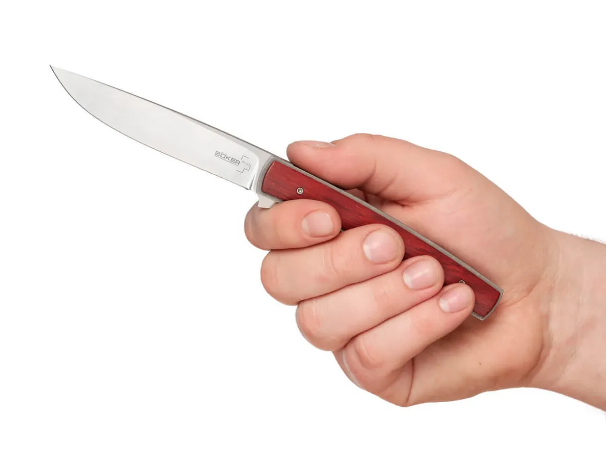 The Long, Gently Curved Version Of The Boker Plus Urban Trapper By Brad Zinker Is A Skillful Combination Of Elegance And Size. The Slender And Light Construction Makes The Urban Trapper Gentleman A Thoroughly Aesthetic And Appealing Pocketknife. The Titanium Plates Are Equipped With Cocobolo Scales. The Vg-10 Blade With Ball Bearings Opens With A Flipper. With A Clip (Tip-Up).