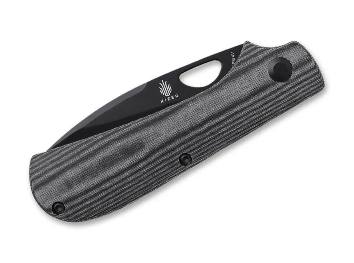 Das Kizer Zipslip Ist Ein Robustes Slipjoint-Taschenmesser Mit Daumenoffnung Und Griffschalen Aus Schwarz-Grau Gemasertem Micarta. Die Klinge Aus Pulvermetallurgischem Cpm-4Vgewahrleistet Eine Ausgezeichnete Schnitthaltigkeit. Das Besondere Kennzeichen Der Konstruktion Ist Die Ruckfeder, Die Sich Auch Beim Offnen Oder Schliesen Der Klinge Nicht Aus Dem Griffrucken Hebt, Sondern Stets Bundig Steht. Mit Clip (Tip-Up/R).