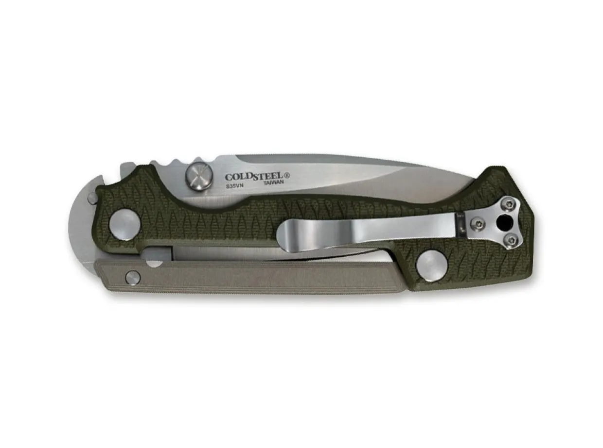 Designed By Andrew Demko, The Cold Steel Ad-15 Is A Large, Robust Pocket Knife With A Blade Made From Powder-Metallurgical Cpm-S-35Vn. The Spear Point Blade Opens With A Double-Sided Thumb Stud And Is Secured With The Innovative Scorpion Lock. The Aluminum Lock Bar Arches Over The Back Of The Handle Onto The Blade Like A Scorpion’S Tail, Thus Giving The Locking Mechanism Its Name. The Textured Handle Scales Are Made From Green G10 And Sit Comfortably In The Hand. The Finger Choil And Jimpings In The Area Of The Thumb Rest Further Increase Safety. The Sturdy Pocket Knife Is Suitable For Both Left Handed And Right Handed Users Thanks To The Reversible Clip (Tip-Up/L-R). With Lanyard Hole.