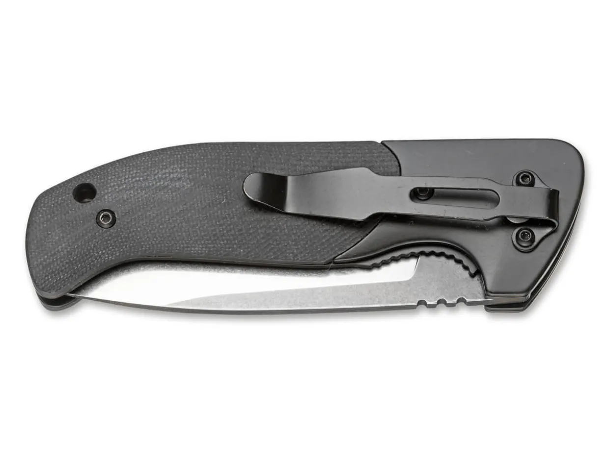 Das Stabile Magnum Dolos Ist Ein Klassisches Zweihandmesser, Das Per Nagelhau Geoffnet Und Durch Einen Linerlock Gesichert Wird. Die Klinge Aus 440A Ist Mit Einem Dunklen Stonewash-Finish Versehen, Das Gebrauchstuchtigkeit Ausstrahlt Und Seinen Teil Zum Besonderen Erscheinungsbild Des Messers Beitragt. Die Griffbeschalung Aus G10 Und Die Dunklen Edelstahlbacken Fugen Sich Optisch Perfekt In Das Gesamtbild Ein. Mit Clip (Tip-Down) Und Fangriemenose.