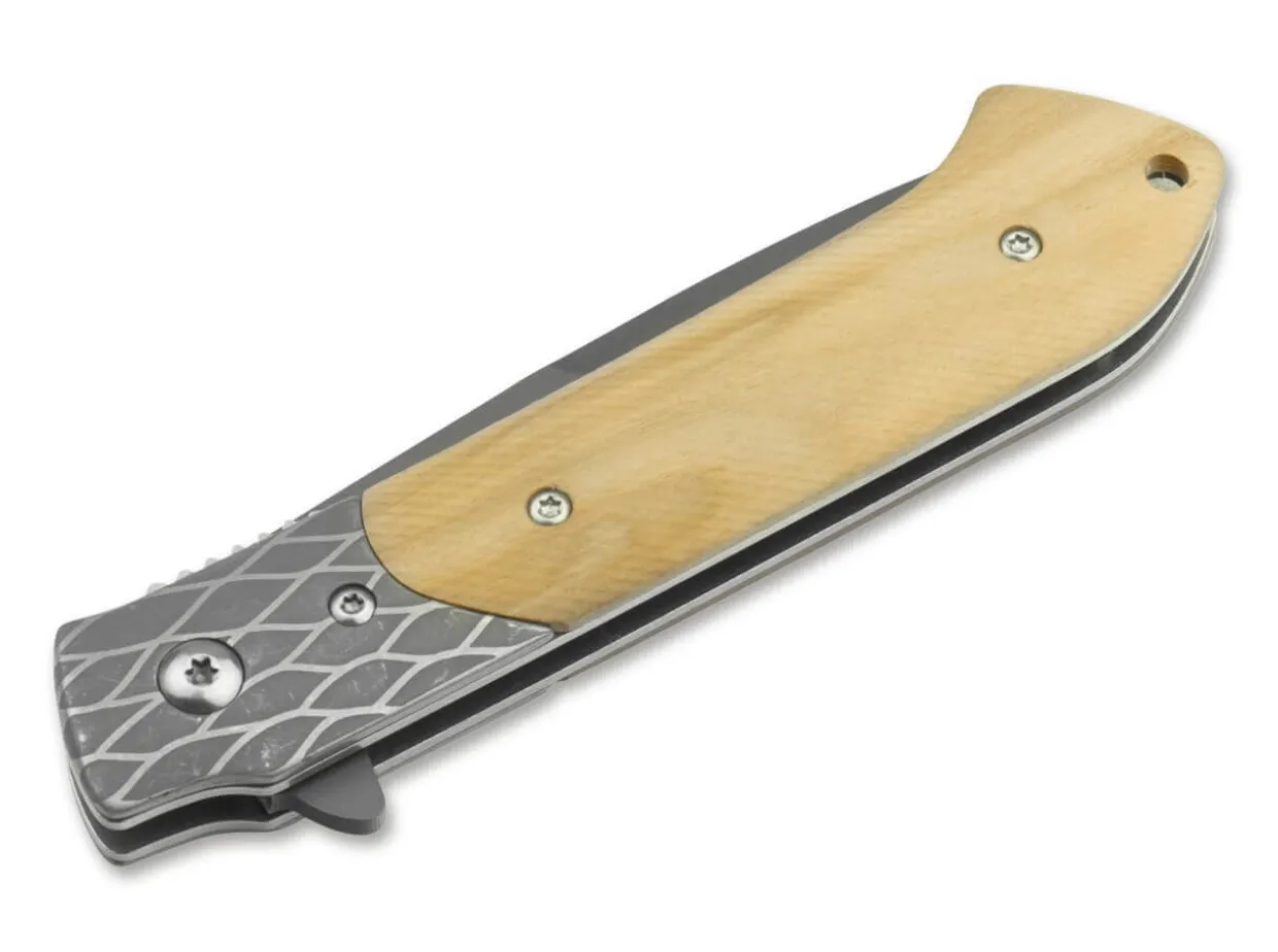 The Magnum Erebos, Equipped With A Modern Flipper, Captivates With Many Extraordinary Details, The Sum Of Which Results In An Amazingly Conclusive Overall Picture With An Unexpectedly Good Hand Position. The Grey Coated Blade Made Of 440A Stainless Steel Has A Short Flute And A Pronounced Ricasso And Is Reliably Secured By A Stable Linerlock. On The Decorative Bolsters There Is A Relief Net Pattern In Two-Tone Finish. The Light Zebra Wood Handle Scales Are Finely Textured And Always Fit Comfortably In The Hand Thanks To The Natural Feel. With Lanyard Hole.