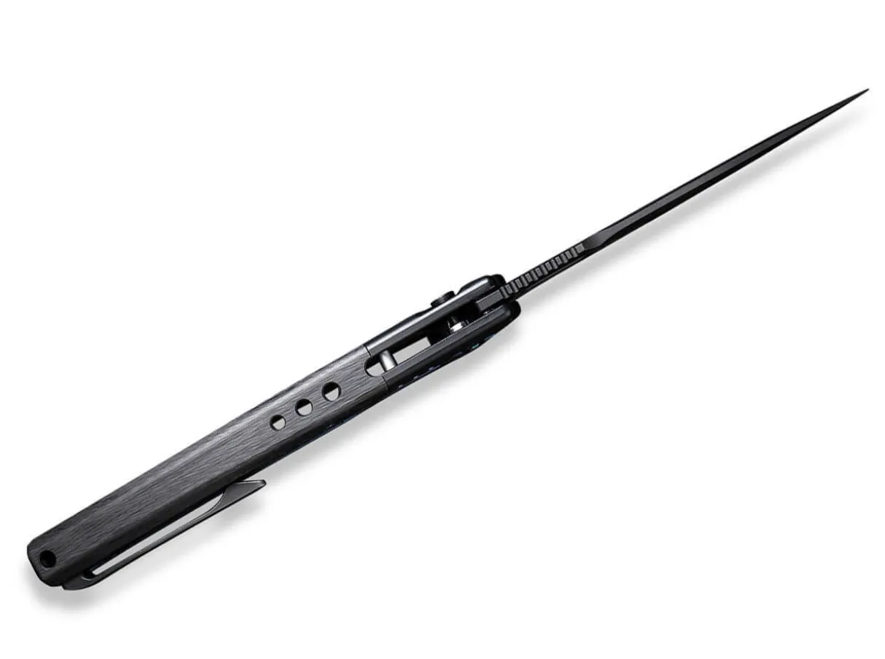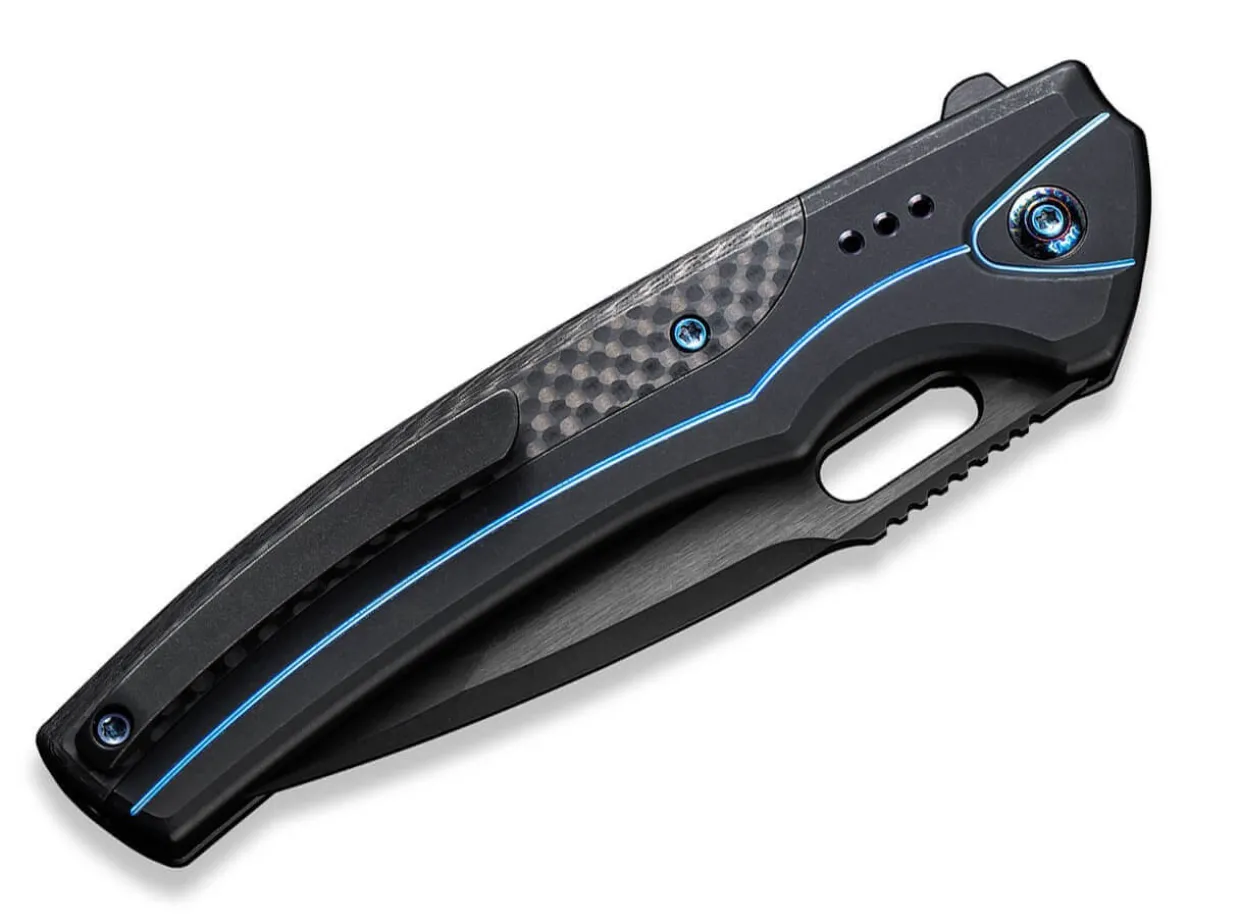 The We Knife Exciton Promises An Elemental Stimulation Of A Special Kind. It Is Not Least The Noble Choice Of Material Of The Model, Strictly Limited To 205 Copies Worldwide, That Provokes A Chemical Reaction Among Knife Enthusiasts. The Ball-Bearing Blade Made Of Powder Metallurgy Cpm-20Cv And Black Coating Opens Sensitively Either By Flipper Or Thumb Hole, While The Button Lock Allows Easy Unlocking Of The Pocket Knife. The Exceptional Black Titanium Handle Features A Carbon Element And Is Adorned By Blue Accents. With Deep Carry Clip (Tip-Up/R).