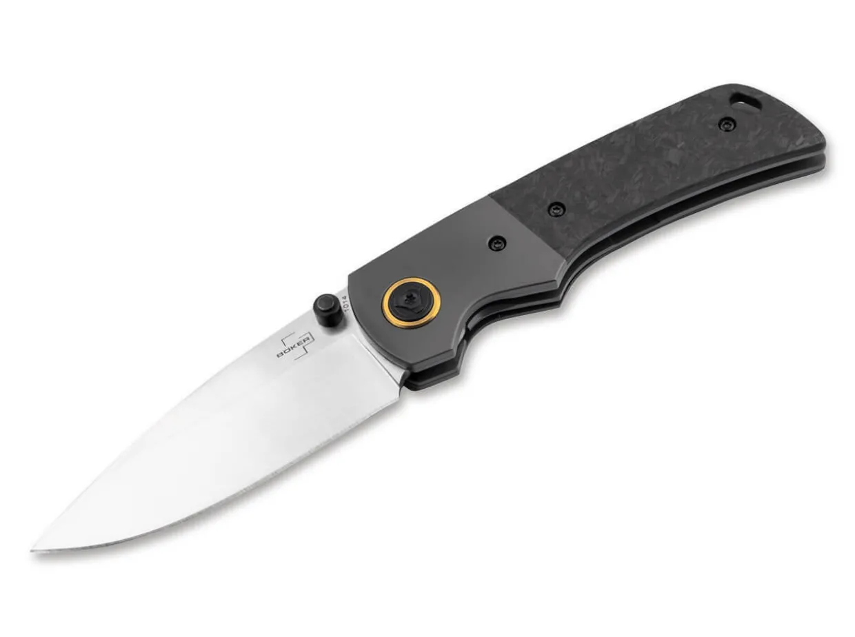 The Modern Boker Plus Gulo Pro Is Now Also Available As A Particularly Classy Version And Impresses With Stainless Steel Bolsters And Handle Scales Made Of Wild Carbon Fibre. The Ball-Bearing D2 Blade With An Impressive Satin Finish Is Opened By A Removable Thumb Stud And Secured By A Sturdy Linerlock. The Robust Pocket Knife Was Designed By Steve Kelly From Montana, Who Has Been A Member Of The American Knifemakers Guild Since 2008. A Brass-Coloured Ring Around The Blade Axle Screw Adds A Visual Accent. Supplied With A Lanyard Hole, A Detachable Clip (Tip-Up/R) And A High-Quality Nylon Pouch For Storage.