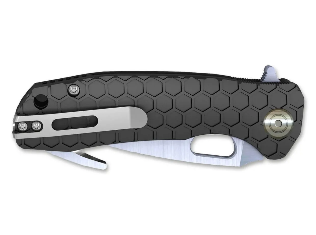What Is Particularly Impressive About The Honey Badger Hook Large Is Its Durable Construction. The 8Cr13Mov Drop Point Blade Is Extremely Robust And Easy To Sharpen. The Sharpened Gut Hook On The Back Of The Blade Enhances The Knife’S Versatility And Can Also Be Used As An Emergency Seat Belt Cutter. The High-Quality Ball Bearing Pivot Enables Smooth Opening And Closing Of The Satin-Finish Blade, Either With The Flipper Or Thumb Opening. The Honeycomb Pattern On The Textured, Black Frn Handle Scales Ensures A Secure Grip. With Lanyard Hole And Reversible Deep-Carry Clip (Tip-Up/L-R).