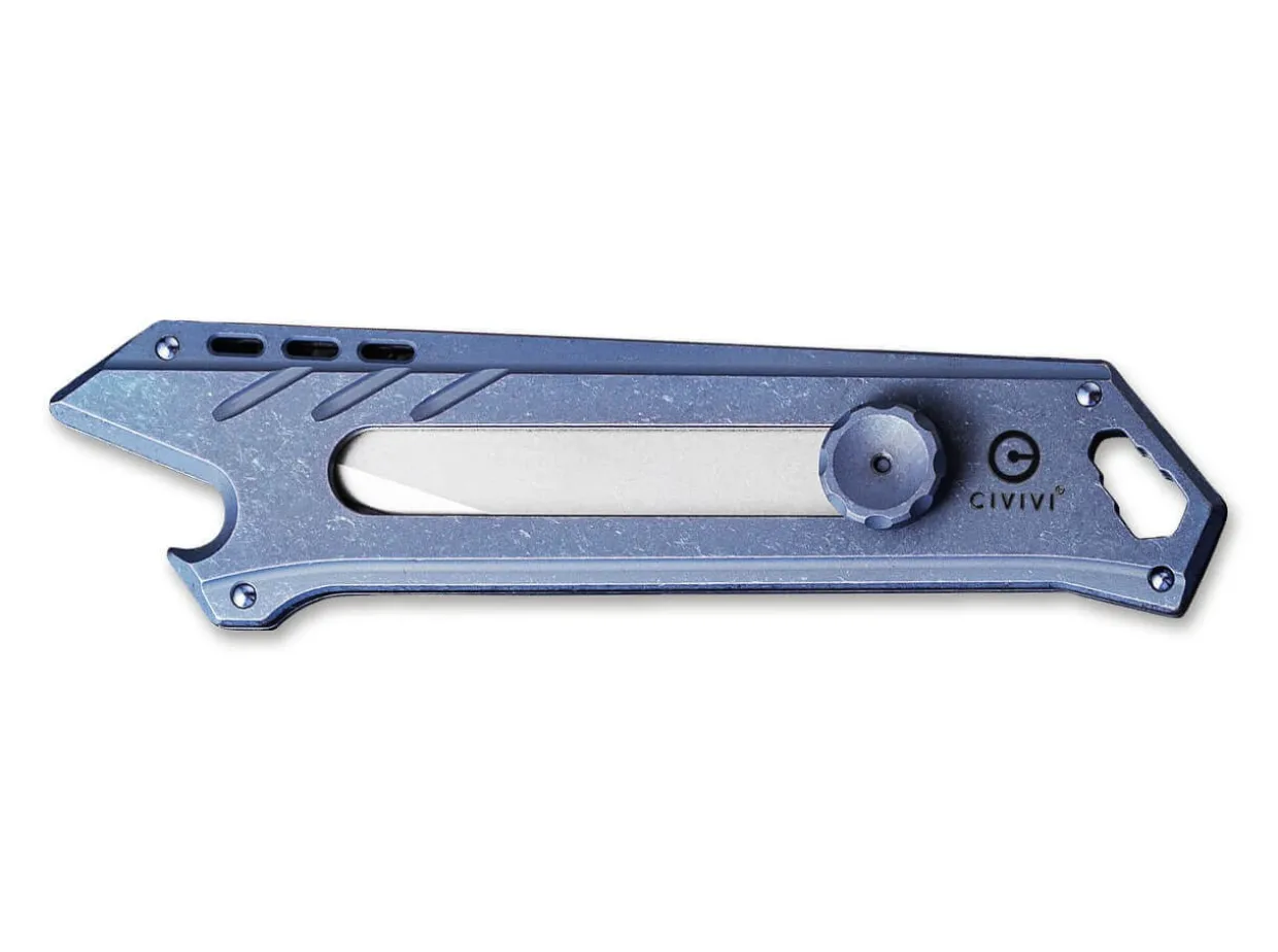 The Civivi Mandate Is A Compact Knife With An Extendable And Replaceable Blade. The Blue Handle Is Made Of Milled Titanium, And Has An Easy, One-Hand Action. When Closed, The Handy Pocket Knife Can Also Be Used As A Bottle Opener. The Lanyard Hole Also Functions As A Practical Bit Holder, Which Is Compatible With Different Sizes. The Knife Comes With Two 9Cr18Mov Blades And One Damascus Steel Blade. With Clip (Tip-Down).