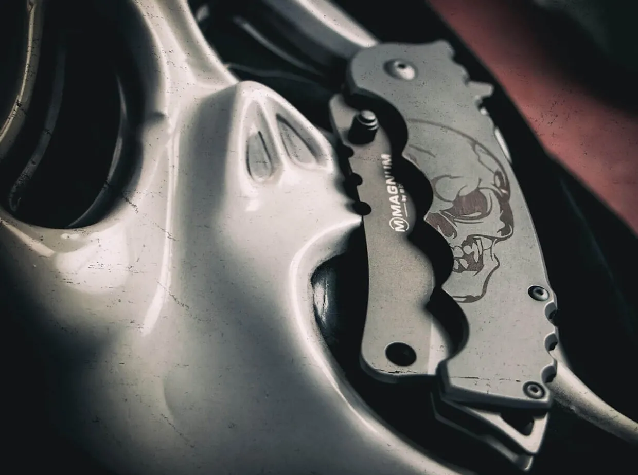 The Unusual Blade Of The Magnum Mortem Is Made From 440 A And Opens With The Flipper Or The Double-Sided Thumb Pin. While The Framelock Is Attached To The Back Scale, The Front Of The Stainless Steel Handle Is Adorned With A Stylized Skull. The Pronounced Jimpings On The Thumb Plate Help Achieve Controlled Cuts. With A Clip (Tip-Down) And Lanyard Hole.