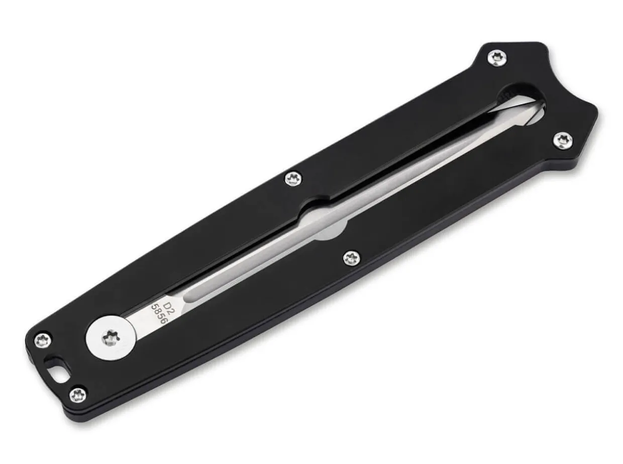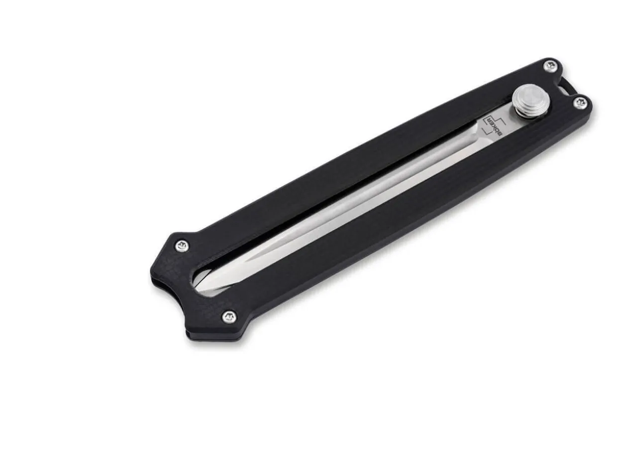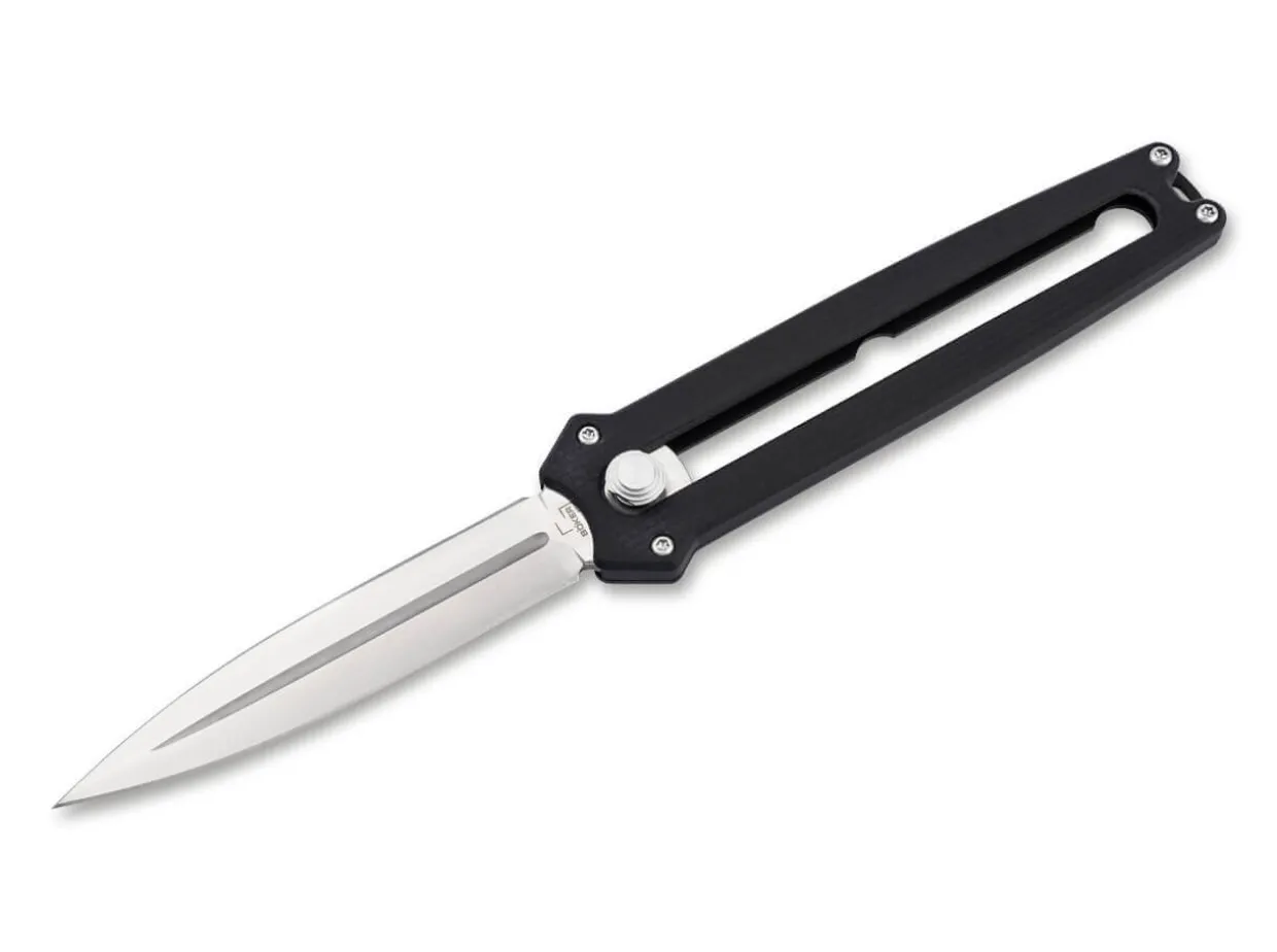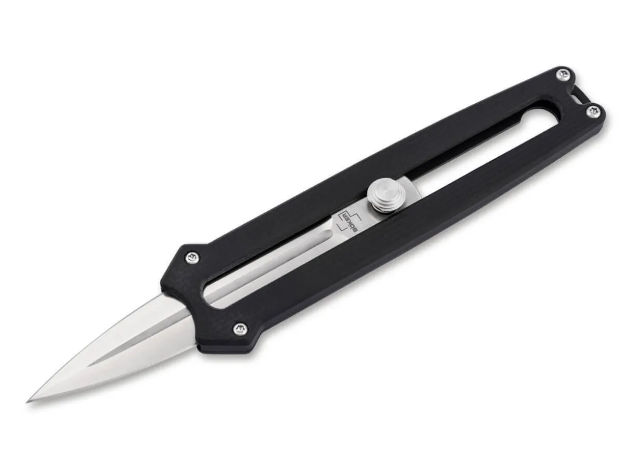 The Innovative Boker Plus Slike Is A Lightweight Dagger Supplied With A D2 Blade Ground On Both Sides That Is Slid Out Of The Handle Frontally. Comparable To The Mechanism Of The Widely Used Utility Knives, The Lock Is Released At A Touch Of The Button And The Satin-Finished Blade Is Then Moved Up Or Down Manually. A Detent At The Halfway Point Further Enhances Work Safety. It Is Supplied With A Modern Flat Grind And A Pronounced Groove. The Cnc-Machined Handle Scales Made Of Black G10 Lie Comfortably In The Hand Despite The Pocket Knife’S Small Size. With Lanyard Hole And Large-Sized Deep-Carry Clip (Tip-Down).