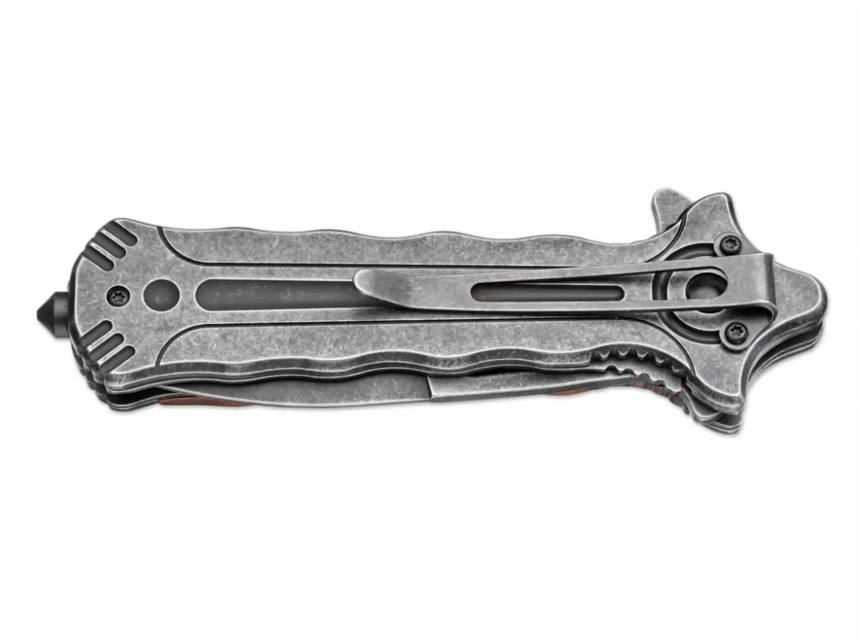 This Design Successfully Bridges The Gap Between A Classic Pocket Knife And A Modern Rescue Knife. The Spring-Assisted 440A Blade Features Decorative Perforations And Has A Dark Stonewash Finish To Match The Handle. The Blade Is Engaged By A Liner Lock. The Solid Handle Construction Has Refined Wooden Scales, A Clip And Glass Breaker That Can Provide Life-Saving Assistance In An Emergency.
