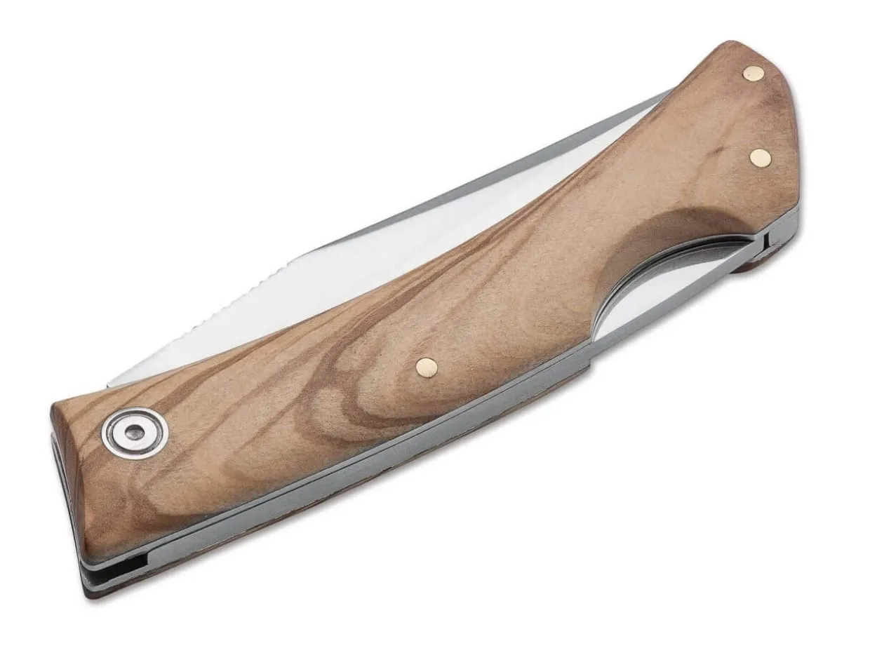 Classic Pocket Knife In A Stylish, Modernized Navaja Shape For Outdoor, Leisure, Or Lunch. The Olive Wood Scales Have Two Cleanly Fitted Inlays Made From Black G10, Which Provide The Special Accent. Satin-Finished 4116 Blade Steel Blade. Back Lock. Shipped With Cordura Belt Pouch.